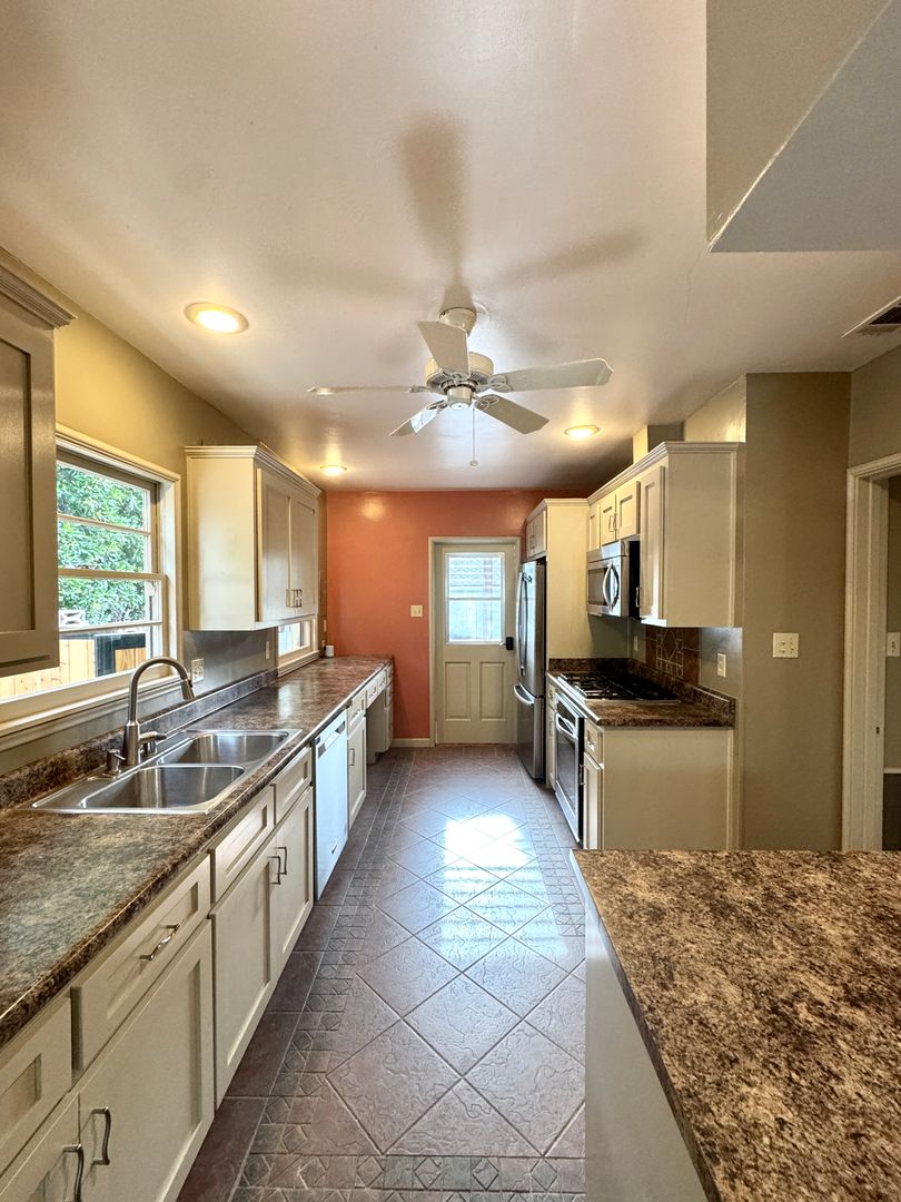 The main house features 2 bedrooms and 2 bathrooms, along with indoor laundry and an updated kitchen with stainless steel appliances, a oversized living room with builtins, a gas fireplace, blending modern convenience with timeless charm.