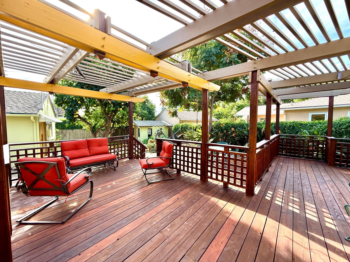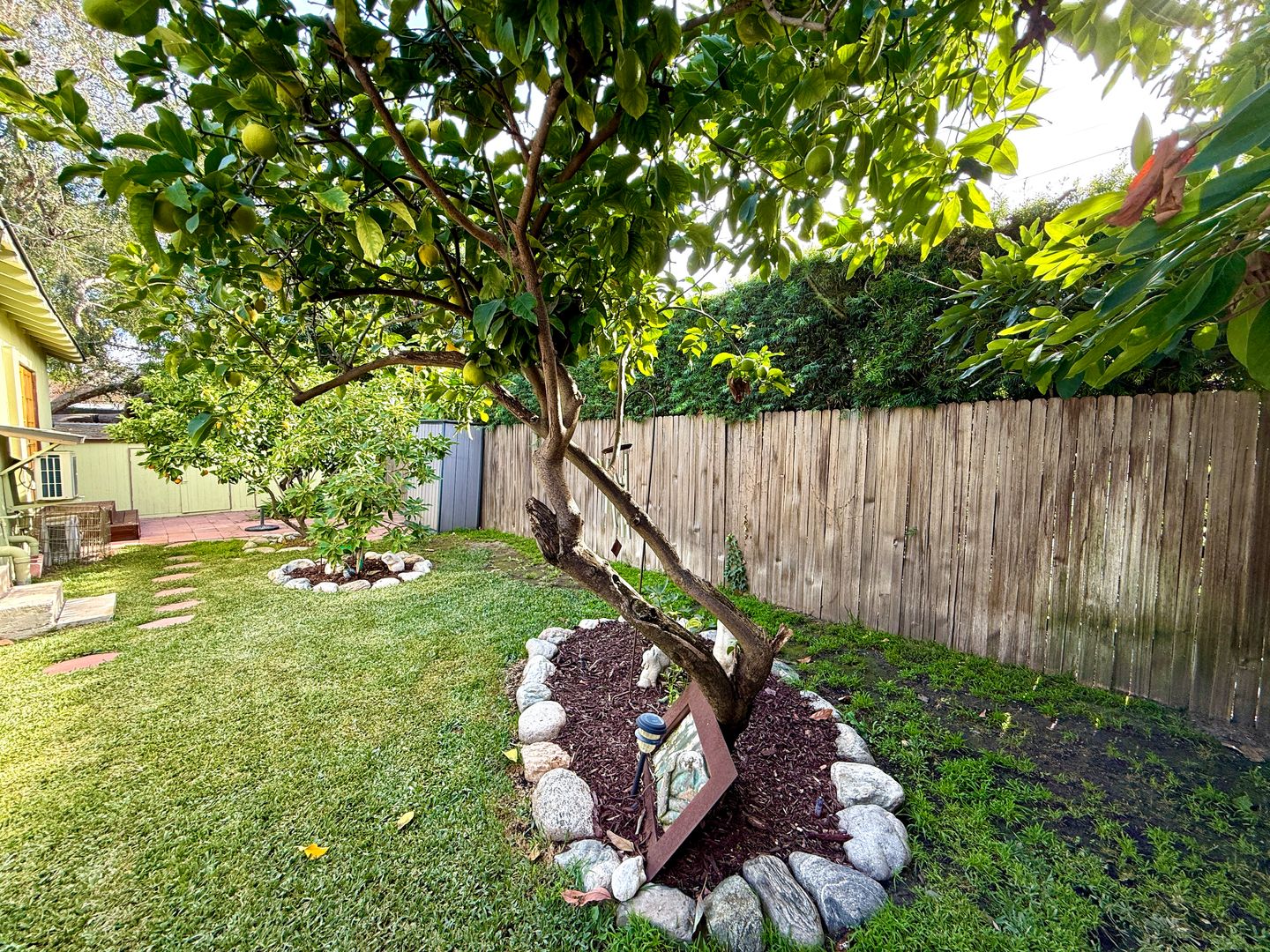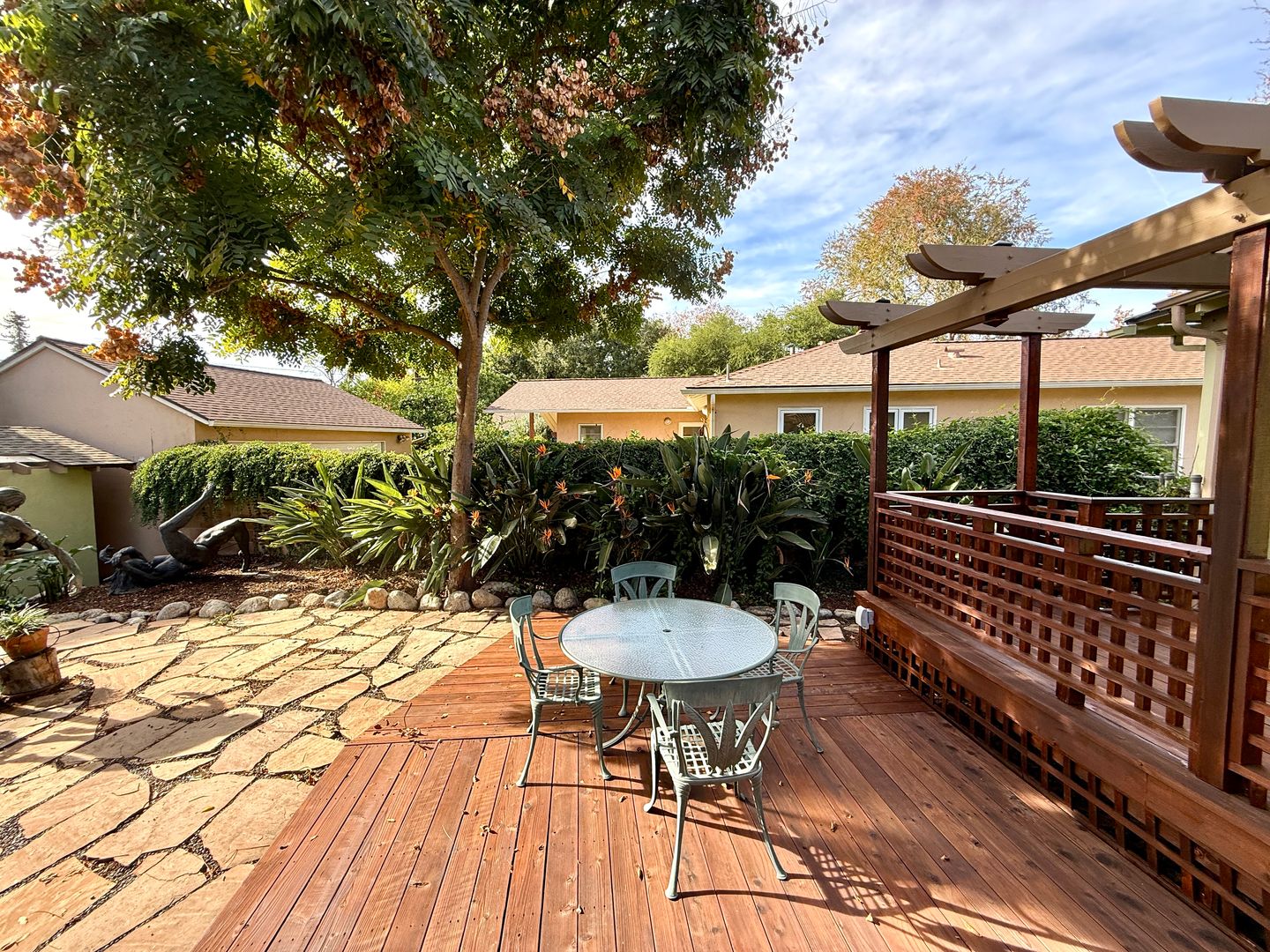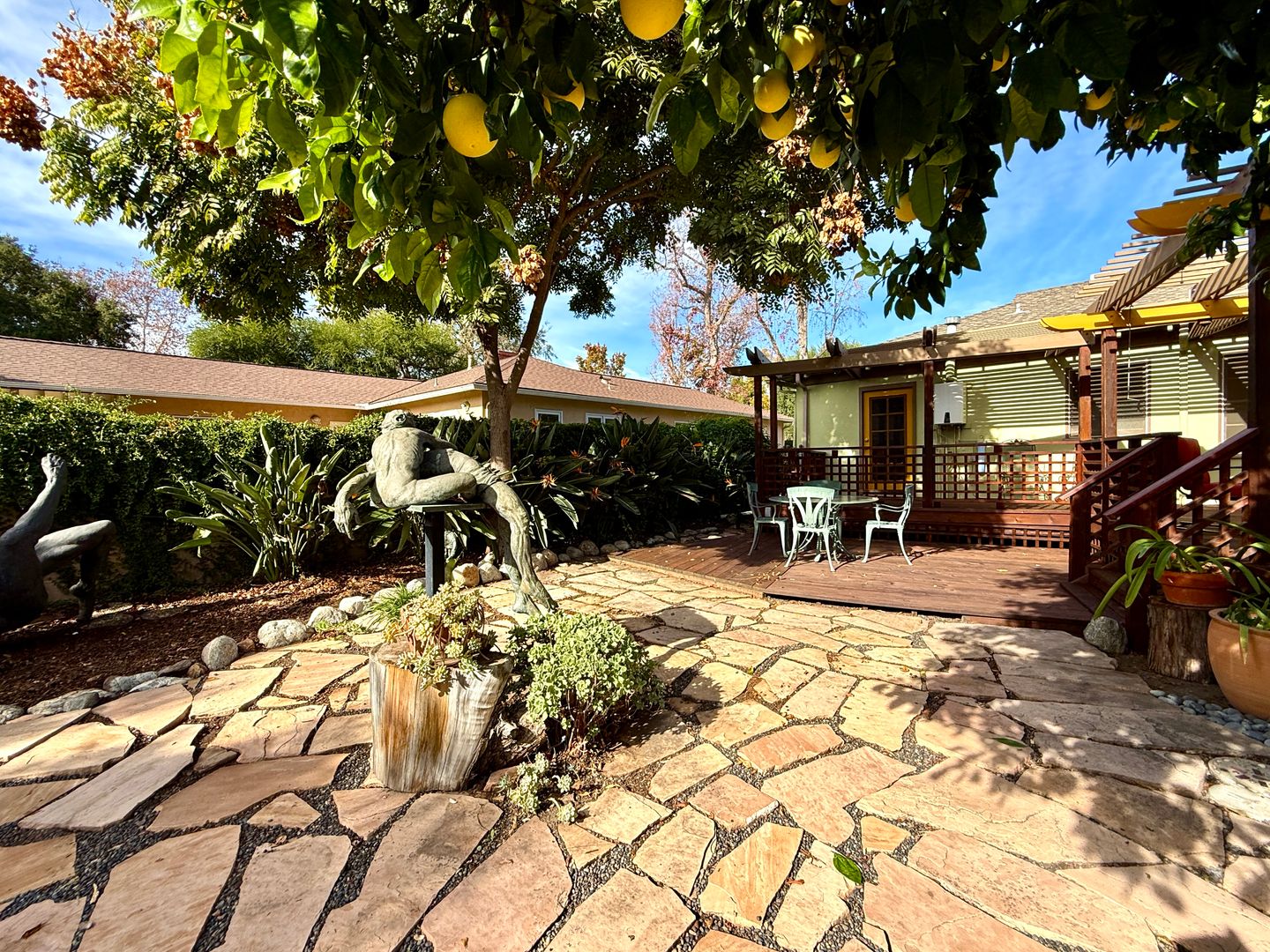 Step into the peaceful, gated backyard oasis, where a spacious deck invites morning coffee, evening conversation, and effortless gatherings. Enjoy a low-maintenance landscape accented by fruit trees, yard sculptures, mature succulents. The primary bedroom in the main home opens directly to the backyard, creating a seamless indoor-outdoor flow and a serene place to unwind.