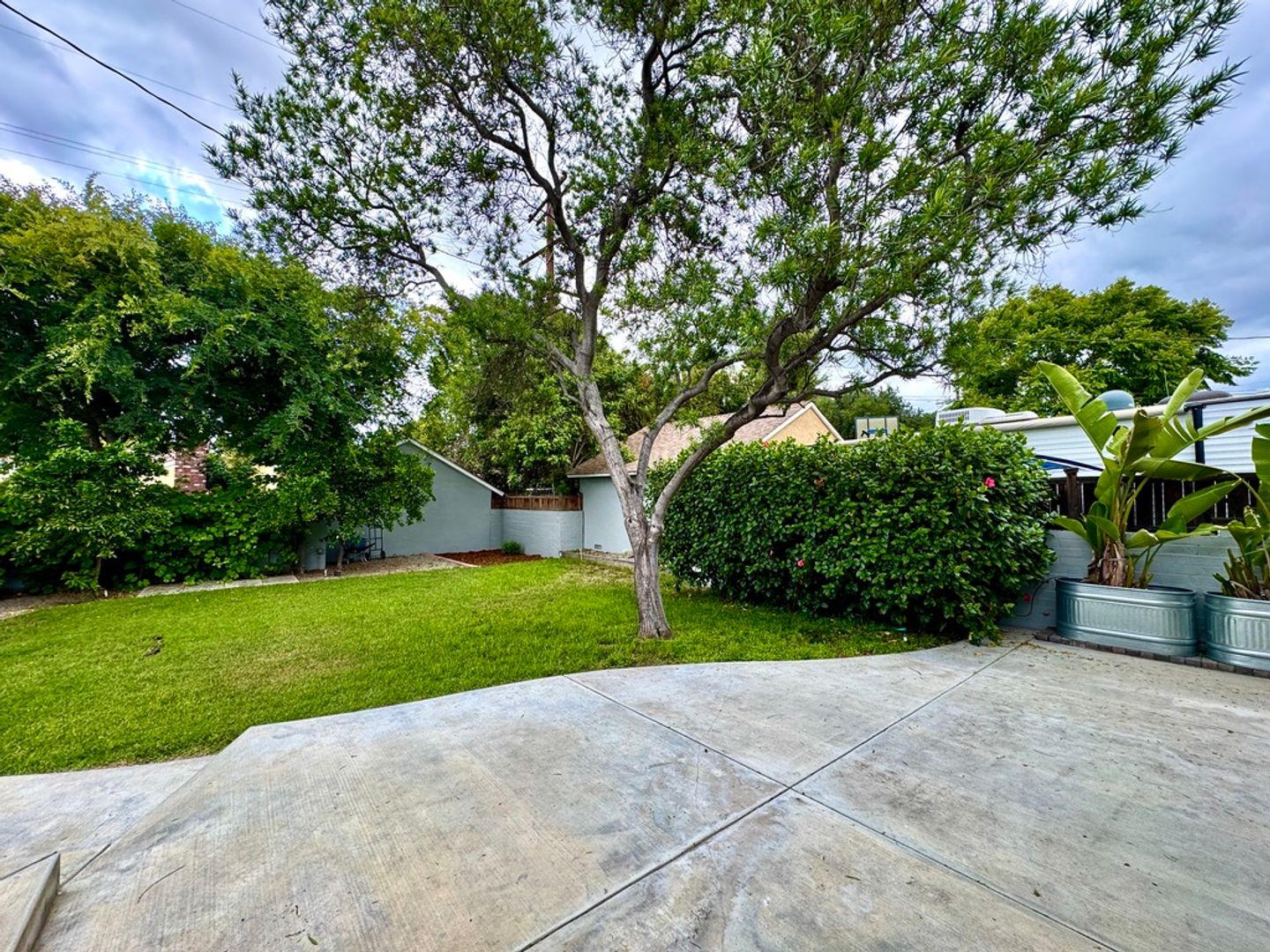 Step outside to discover a serene screened back porch, ideal for relaxing in any weather. The front yard boasts drought-tolerant landscaping, while the lush backyard includes citrus trees and a grassy area perfect for outdoor activities.